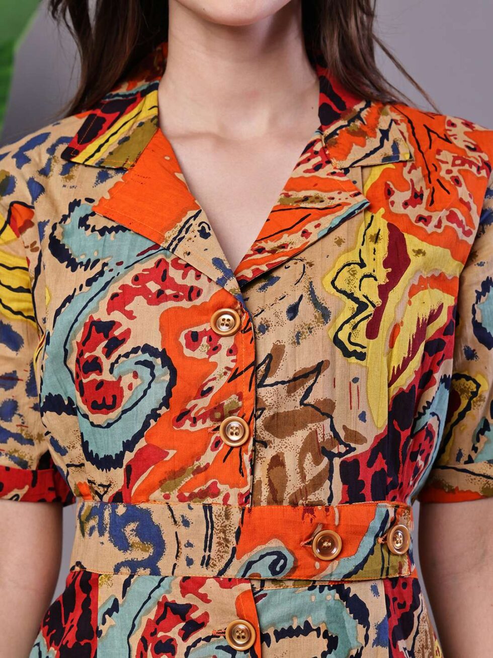 Women’s Bohemian Chic Multi-Color Paisley Print Cotton Collared Midi Dress